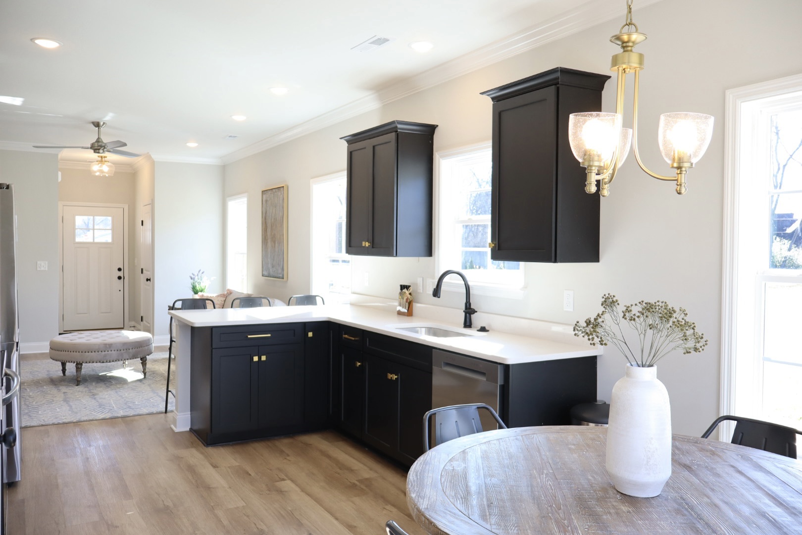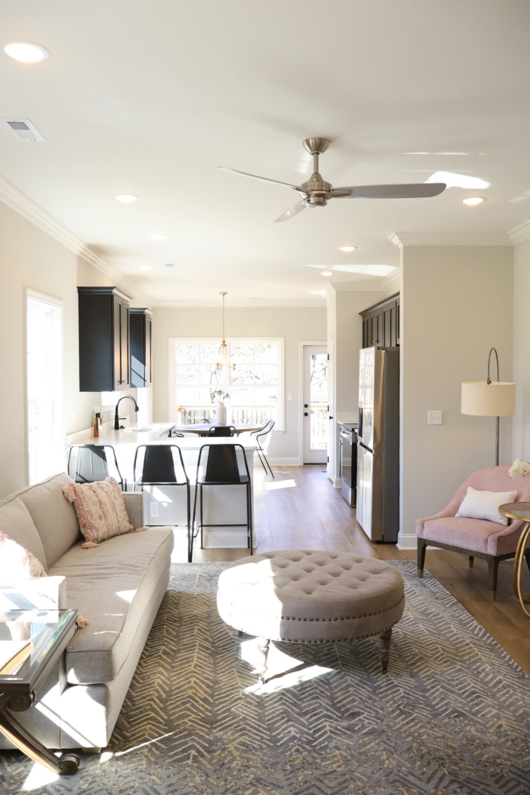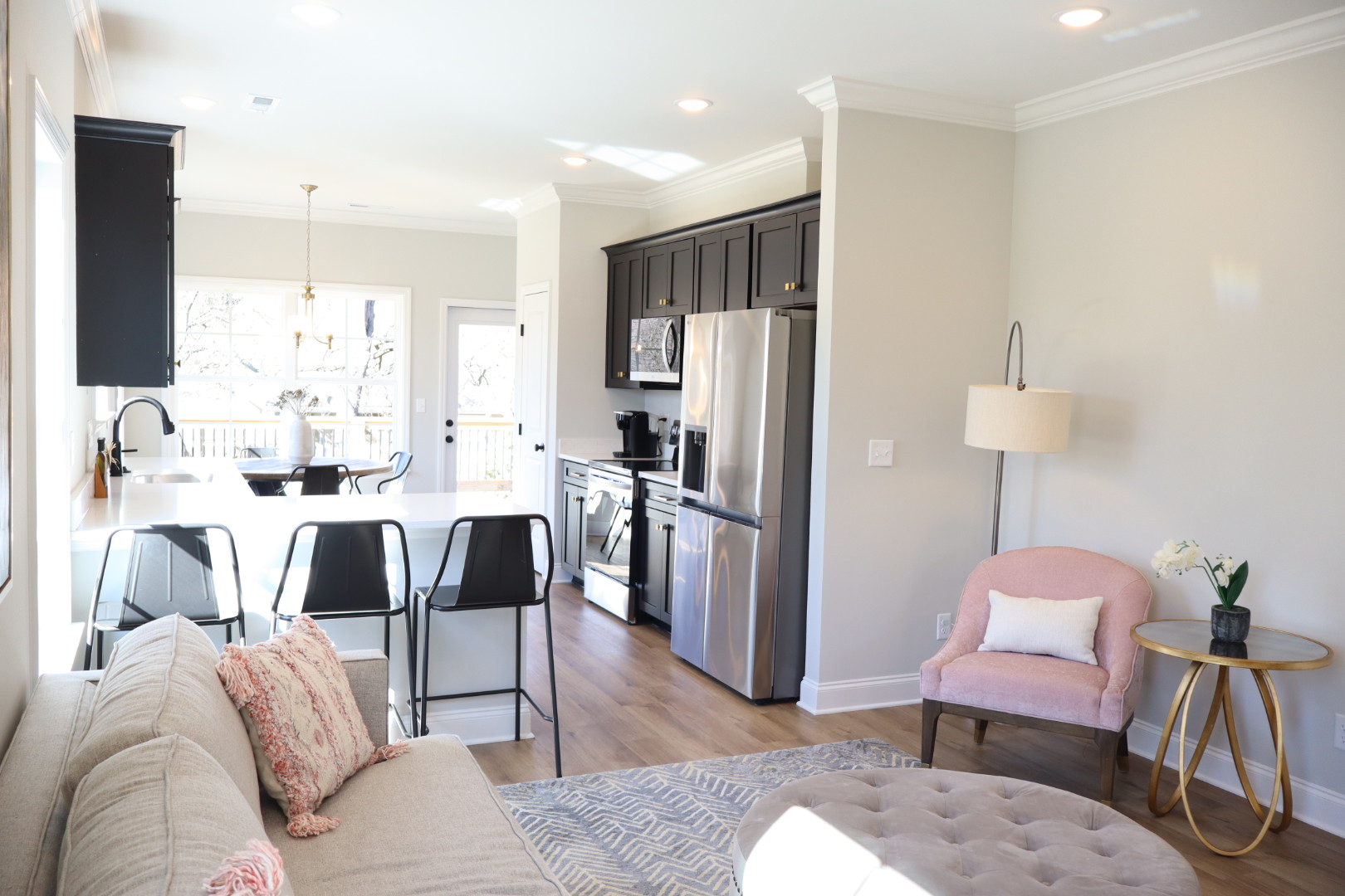 From the moment you step inside, the open layout creates a welcoming atmosphere, seamlessly connecting the living, dining, and kitchen areas with 9-foot ceilings that enhance the sense of space. Whether you’re hosting a small gathering or enjoying a quiet evening, this layout adapts effortlessly to your needs.